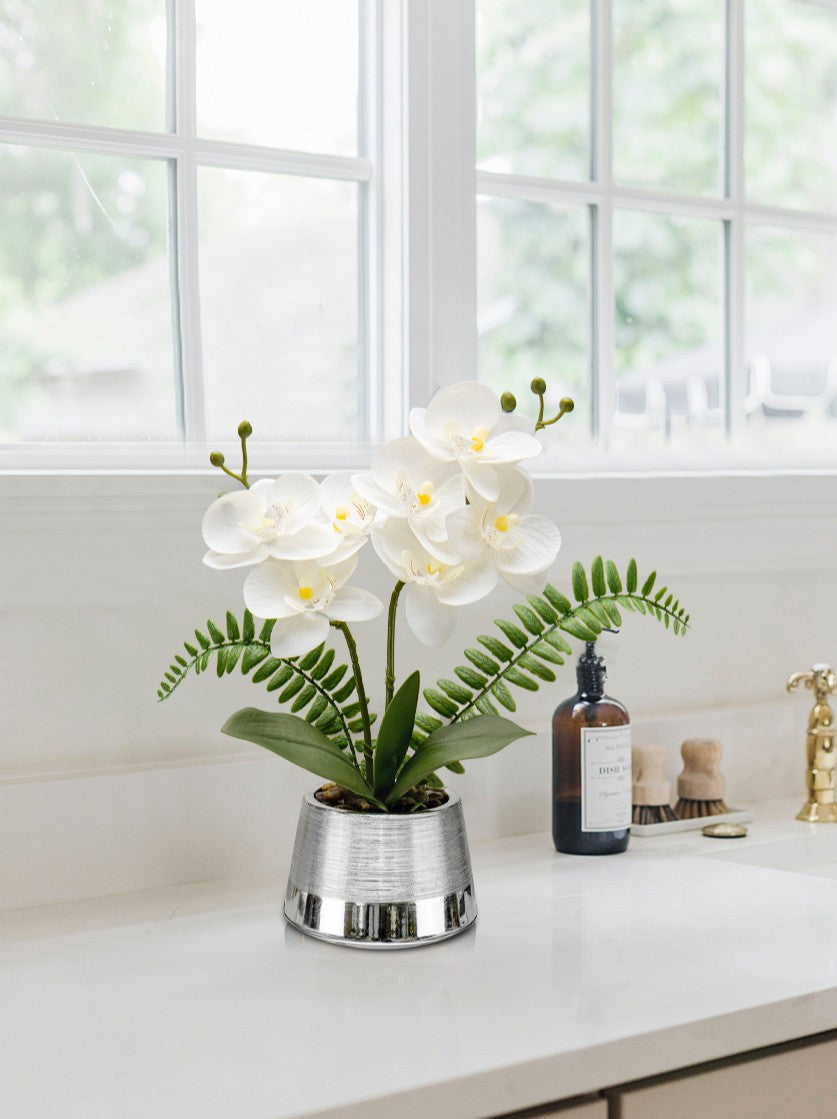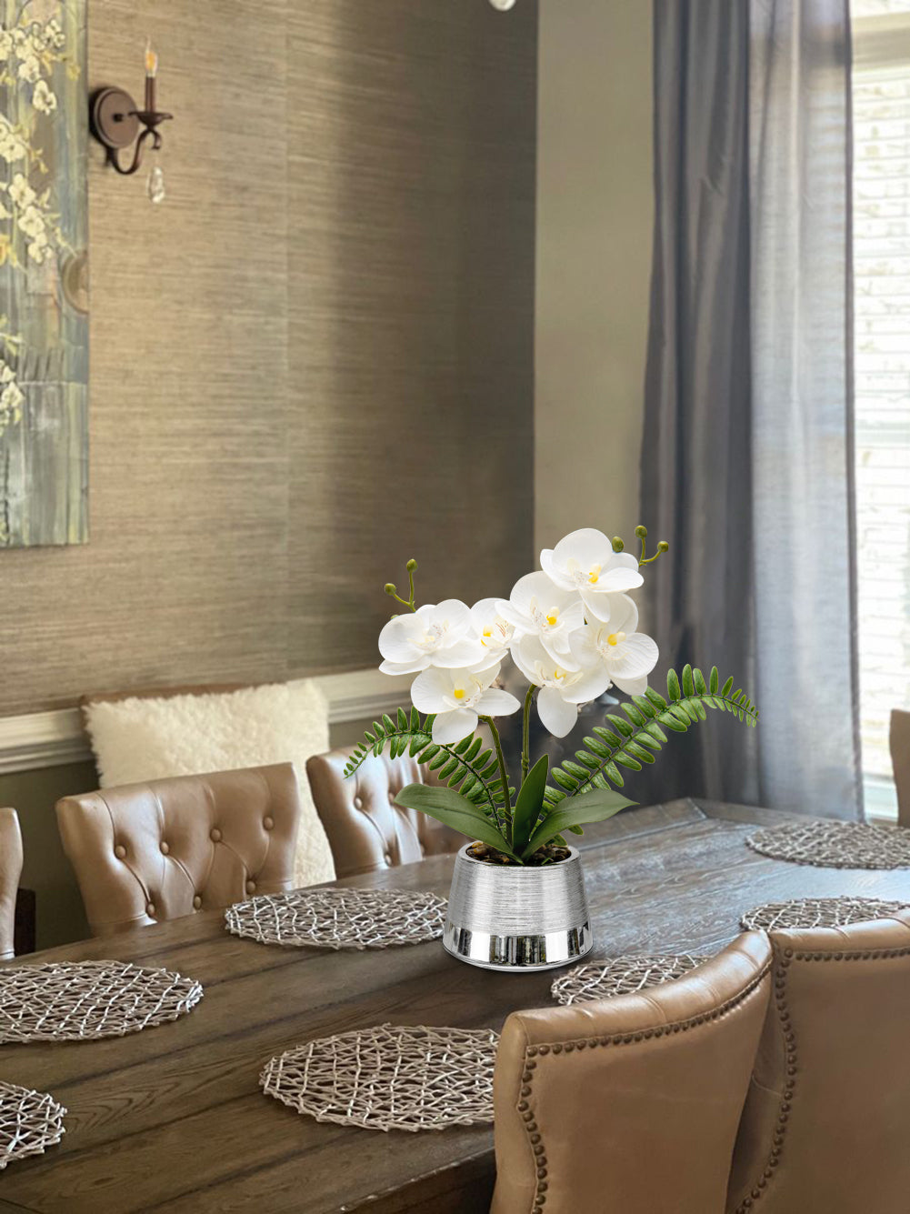 Our artificial orchid arrangements, featuring two green stems, three thick leaves, realistic ferns, and striking white blooms and buds, are elegantly displayed in a silver pot, bringing freshness to your living space. Crafted from high - quality fabric petals, plastic stamens, and premium cloth leaves, the durable and flexible materials allow for bending and reshaping. Safe for people and pets, they're ideal for those allergic to pollen. Standing 12.2" tall overall (flowers 9.1" tall) with a 4.1"(D)x3.1"(H) pot