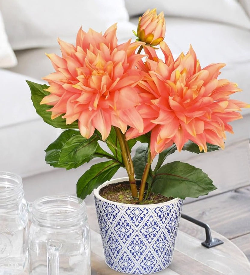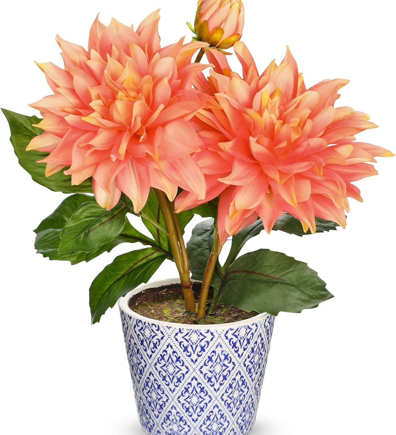 Orange Artificial Silk Dahlia Flower Potted with Blue and White Ceramic Pot