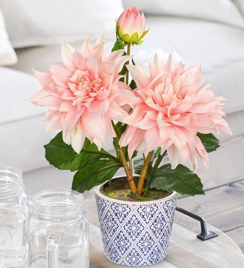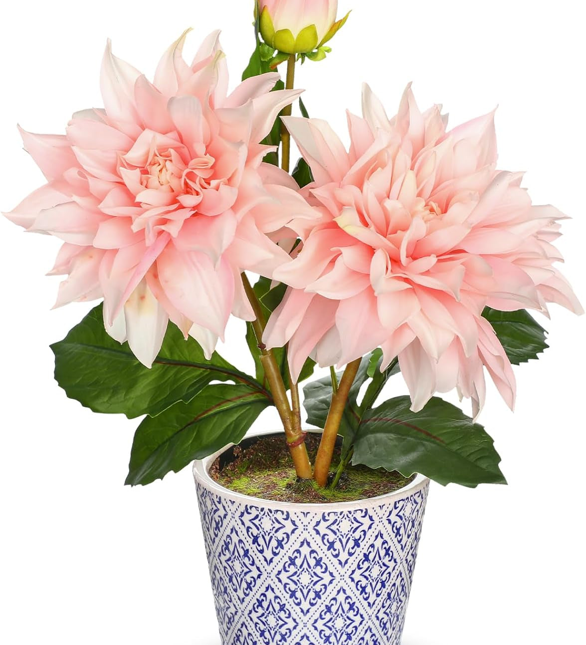 Pink Artificial Silk Dahlia Flower Potted with Blue and White Ceramic Pot