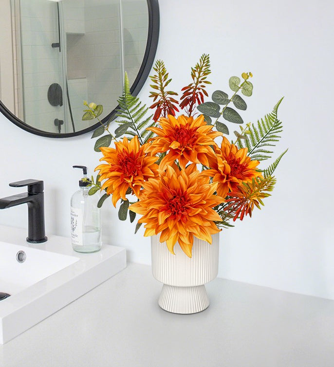 Orange Artificial Silk Dahlia Flower Potted Arrangement with Ceramic Vase
