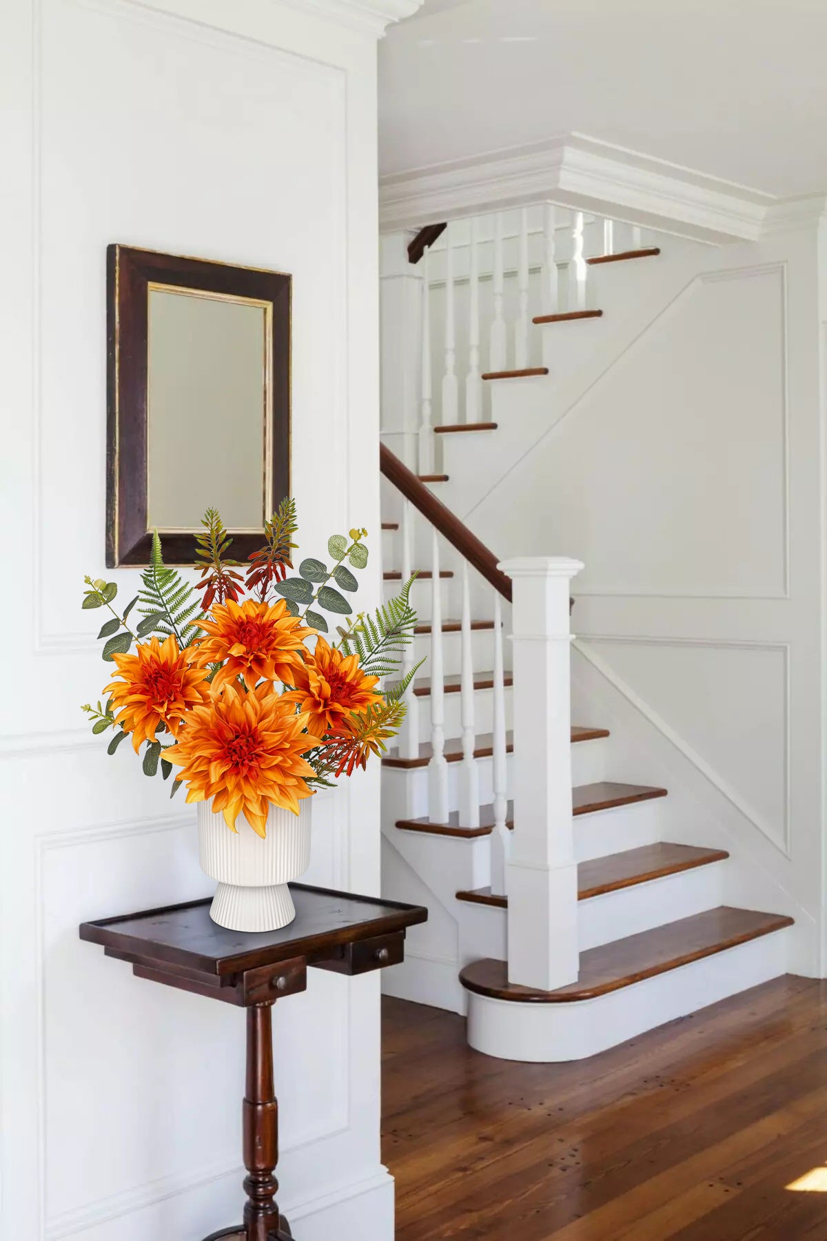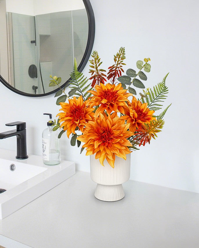 This lifelike artificial floral arrangement, crafted from premium silk, features layered orange dahlias, realistic eucalyptus, ferns, and autumn foliage—boasting rich colors and textures for a vibrant, garden-fresh look. Measuring 18.1 inches tall and 11.8 inches wide, the medium-sized display fits perfectly on tabletops, mantels, or bookshelves, adding charm without clutter. Housed in a 6.2-inch tall white ceramic vase with a flared cone base and ribbed texture, it brings modern sophistication to entryways, desks, and more.