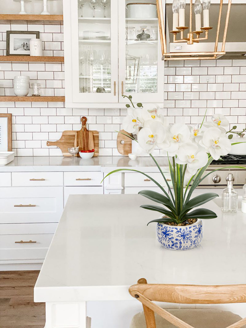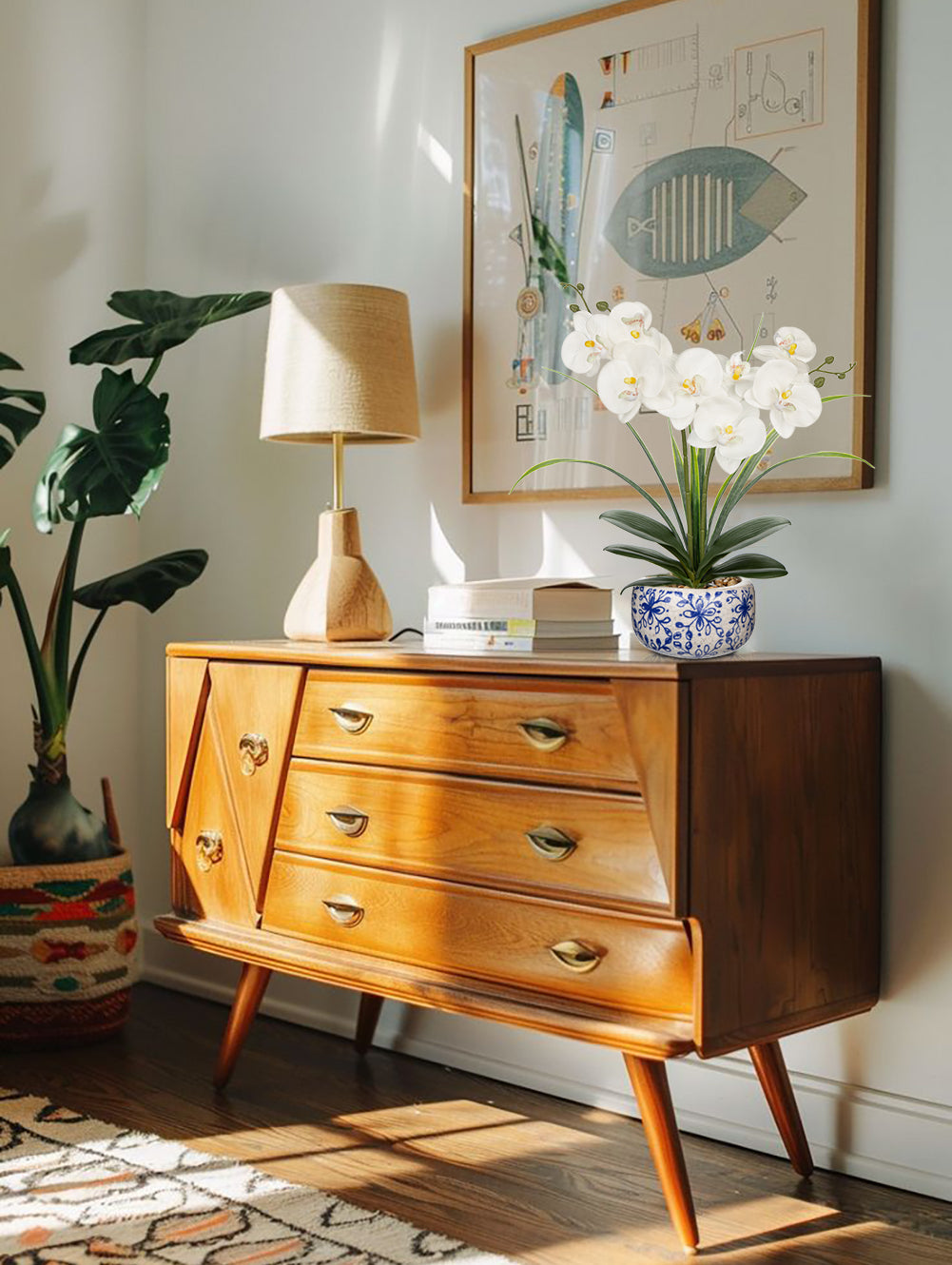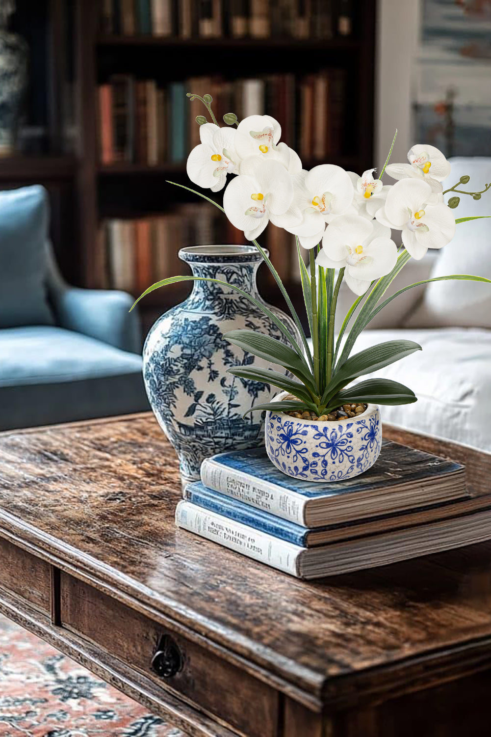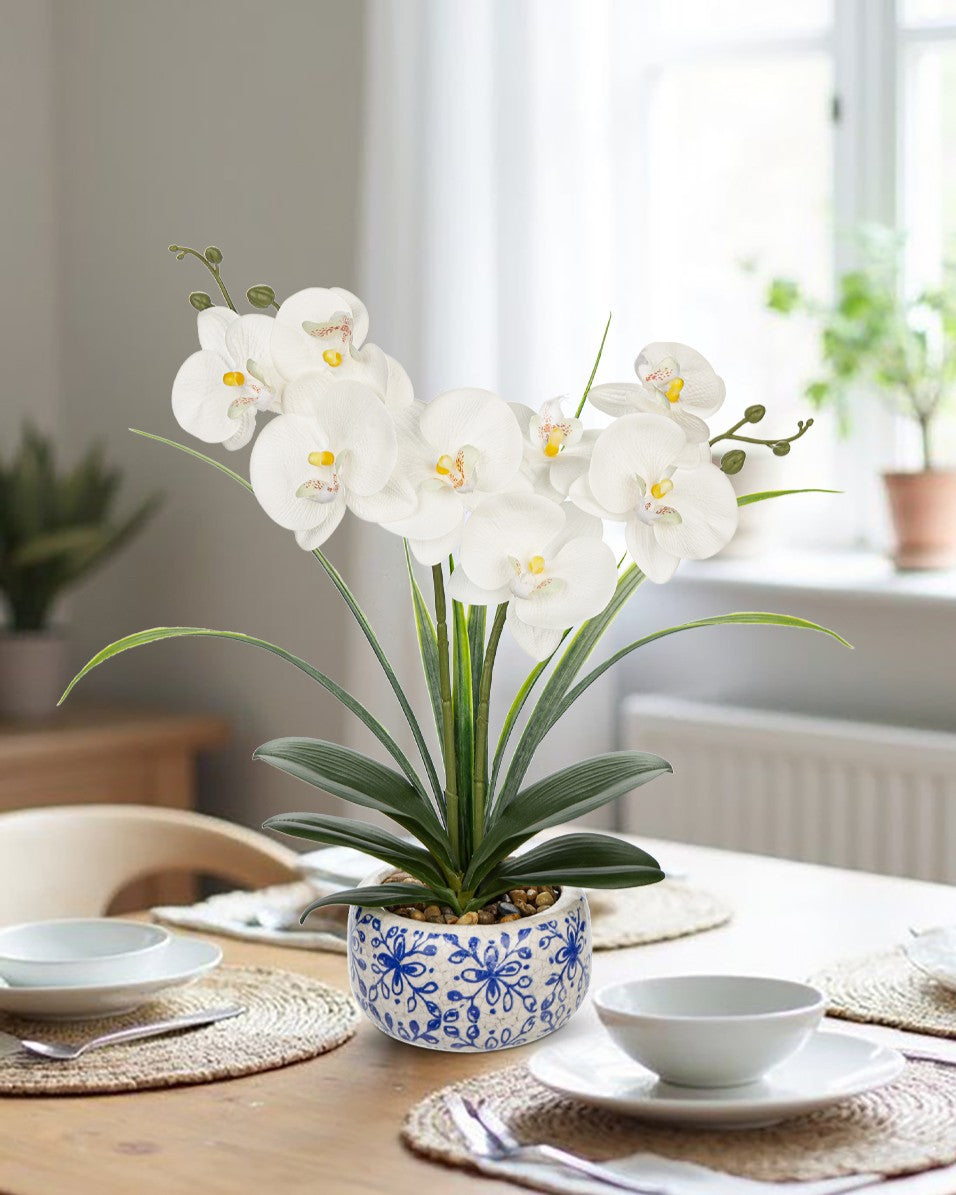 White Orchids Artificial Flowers with Blue and White Pot - 17.7"