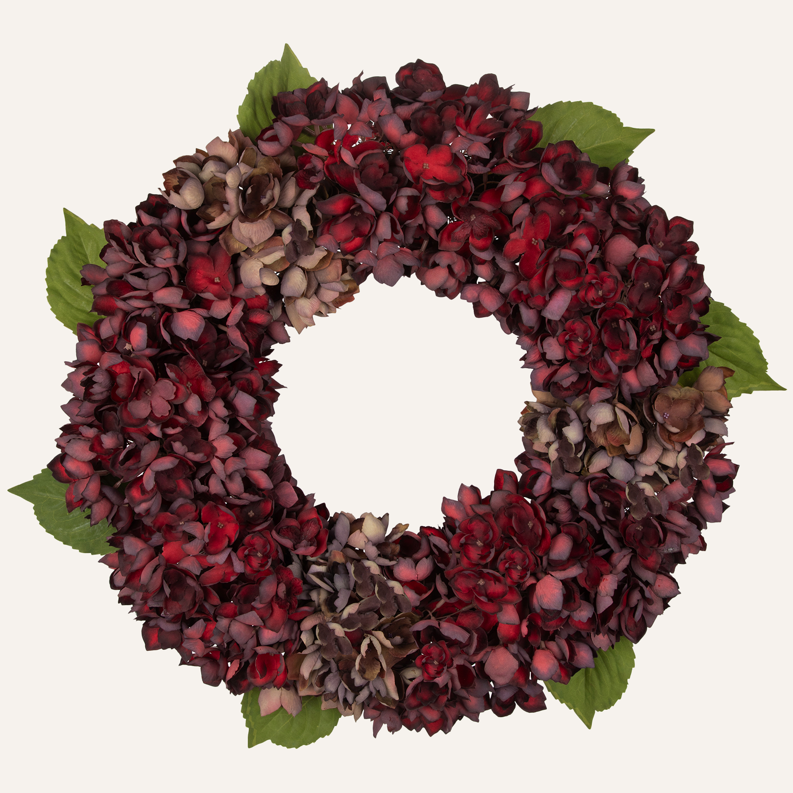 Each hydrangea bloom is made from premium velvet—soft with a subtle sheen, mimicking sun-kissed fresh petals. Fade-resistant dye ensures vibrant maroon color endures outdoor elements like sunlight and light rain. Petals are layered in a natural cascading pattern with hand-stitched details, adding depth and realism.