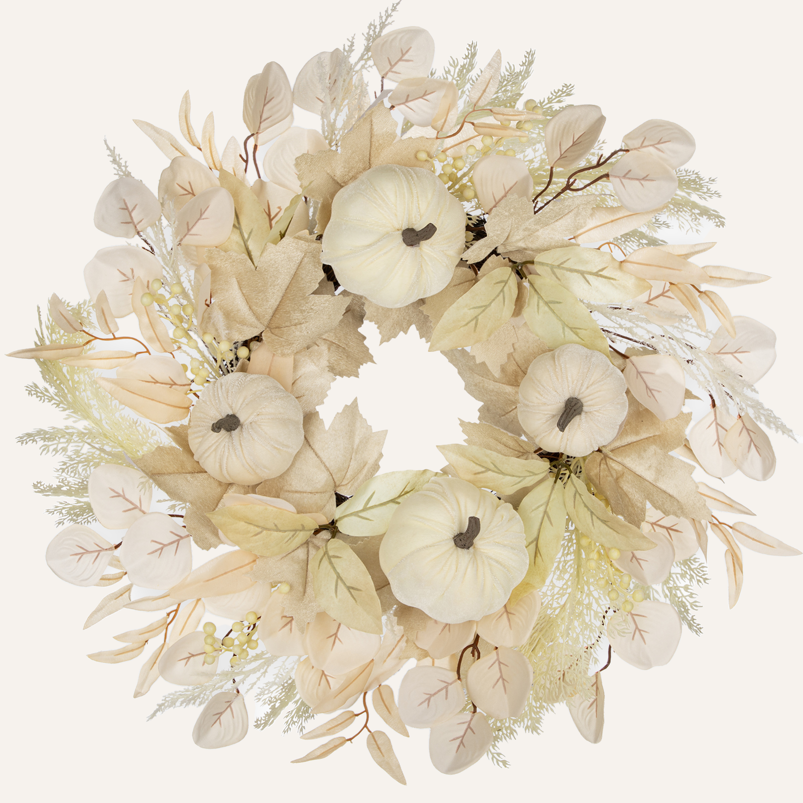 White Fall Artificial Pumpkins Wreaths with Velvet Pumpkins Eucalyptus for Home Decor