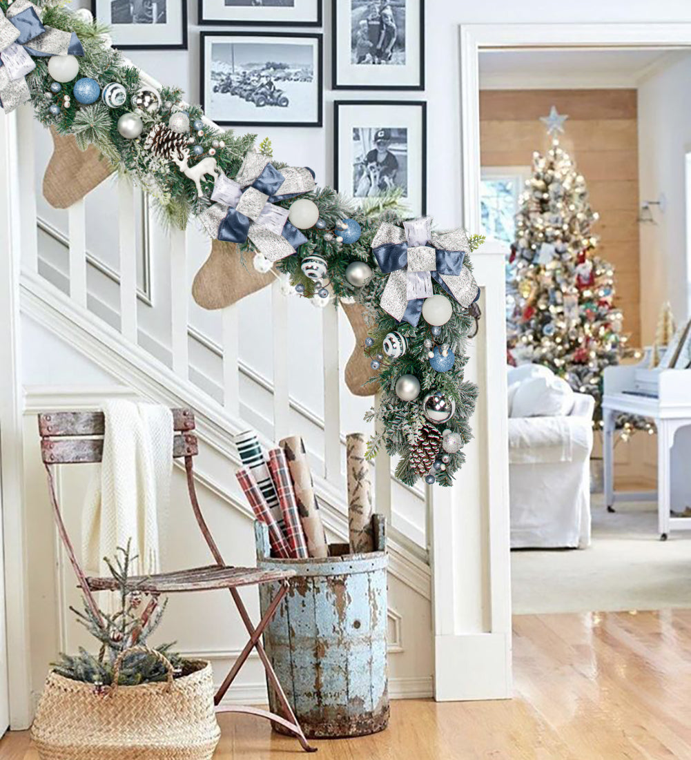 Sliver & Blue Christmas Garland Ornaments with Bows & Balls Decor
