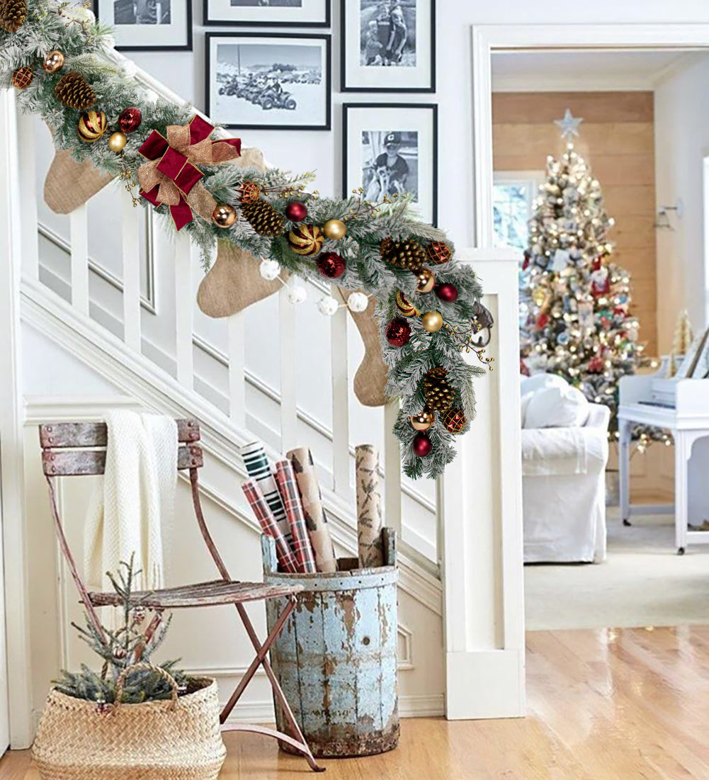 Christmas Garland Ornaments with Red Bows & Balls Decor