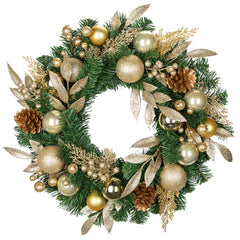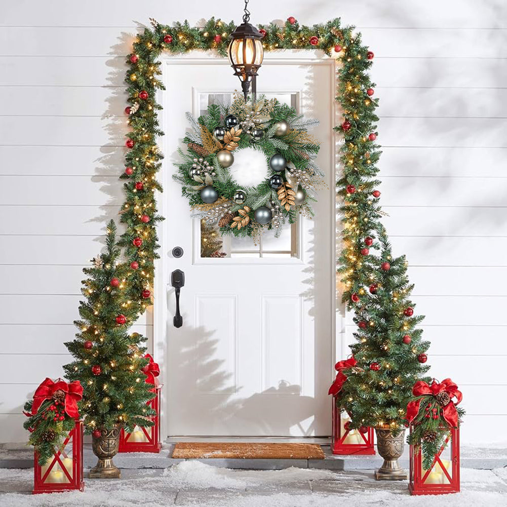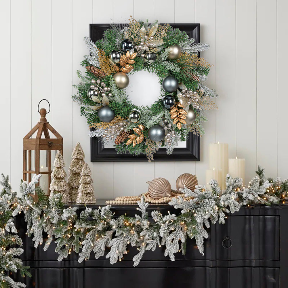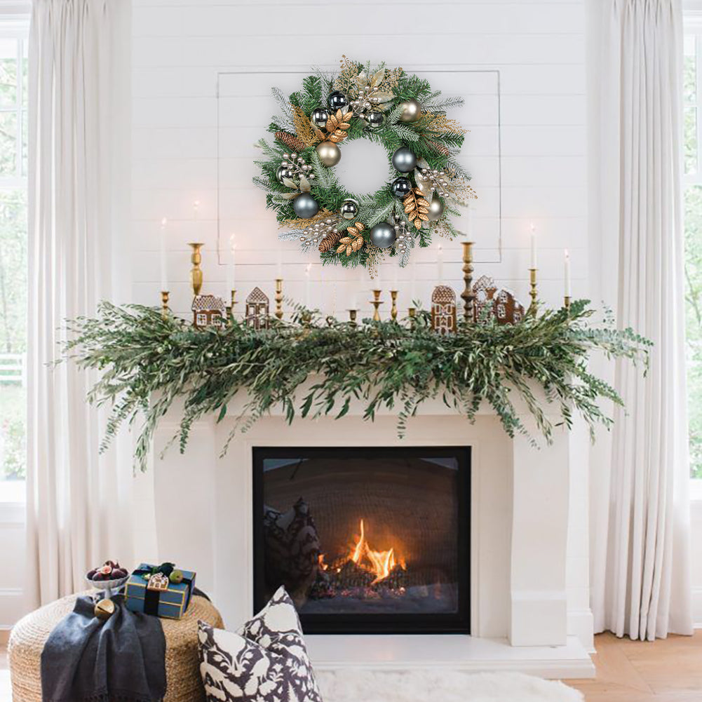 With our 24-inch Christmas Door Wreath—crafted to bring festive magic to your home. Artisans arranged vibrant Christmas balls, rustic pine cones, silver berries, lifelike pine needles, and glittered leaf stems on a natural branch base, while snow-dusted needles add a whimsical winter touch. The ultra-realistic artificial branches make it look freshly cut, capturing the cozy charm of the season.