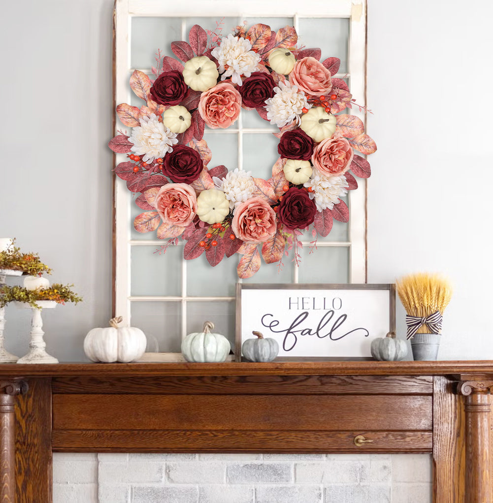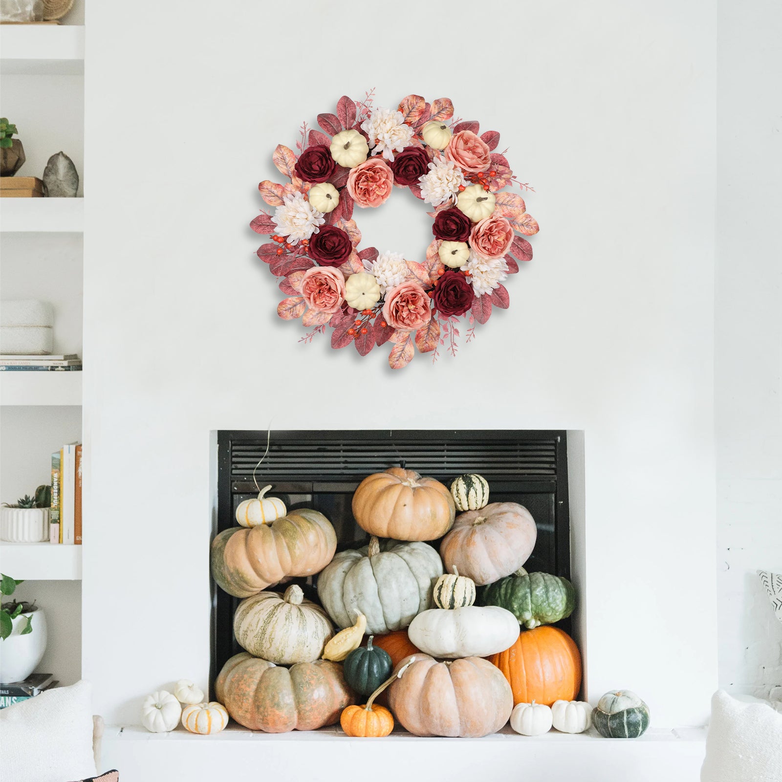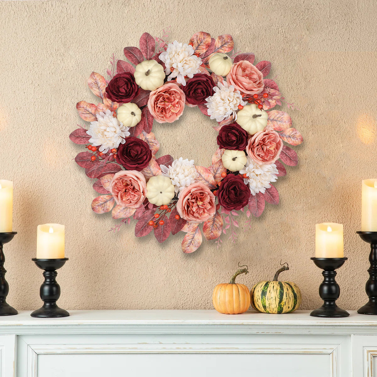 Celebrate fall with this vibrant 24-inch wreath, featuring a lively mix of white pumpkins, chrysanthemums, red roses, and pink eucalyptus, layered over autumn leaves. It adds warmth and elegance to front doors, walls, or fireplaces—making a bold seasonal statement.