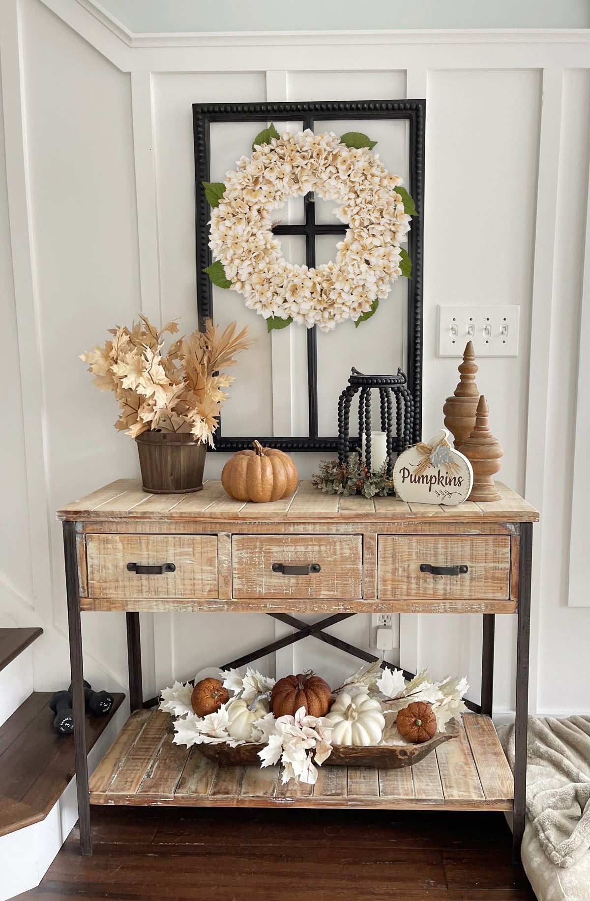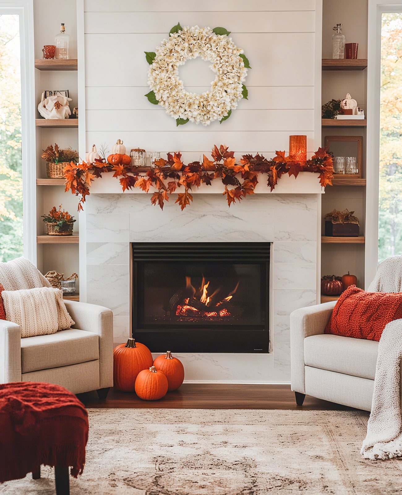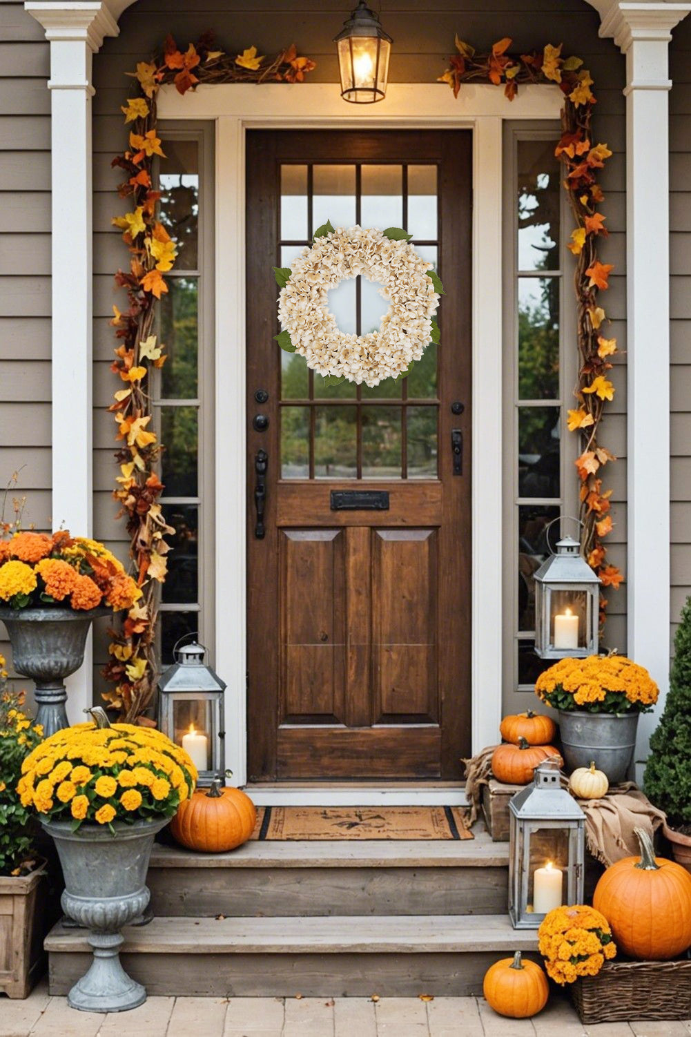 Built on a sturdy, weather-resistant rattan base wrapped in natural jute twine, hydrangeas are securely attached with hidden durable wire, preventing loosening. Durable yet elegant, it thrives outdoors (front doors) or indoors (mantles, entryways), bringing cozy fall charm hassle-free all season.