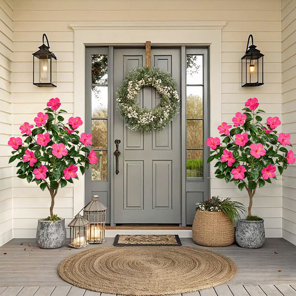 Infuse your space with tropical vibrancy with our 4.13-foot Faux Hibiscus Tree, a striking artificial plant featuring lifelike silk blooms in bold orange, red, and pink hues. Each flower mimics the lush, tropical beauty of real hibiscus, making it a standout addition to your indoor decor collection. Designed for convenience, the tree features a detachable brown trunk for easy assembly, moving, or storage, and comes with a stable pot (5.9”H x 6.3”W) perfectly proportioned to support its structure.