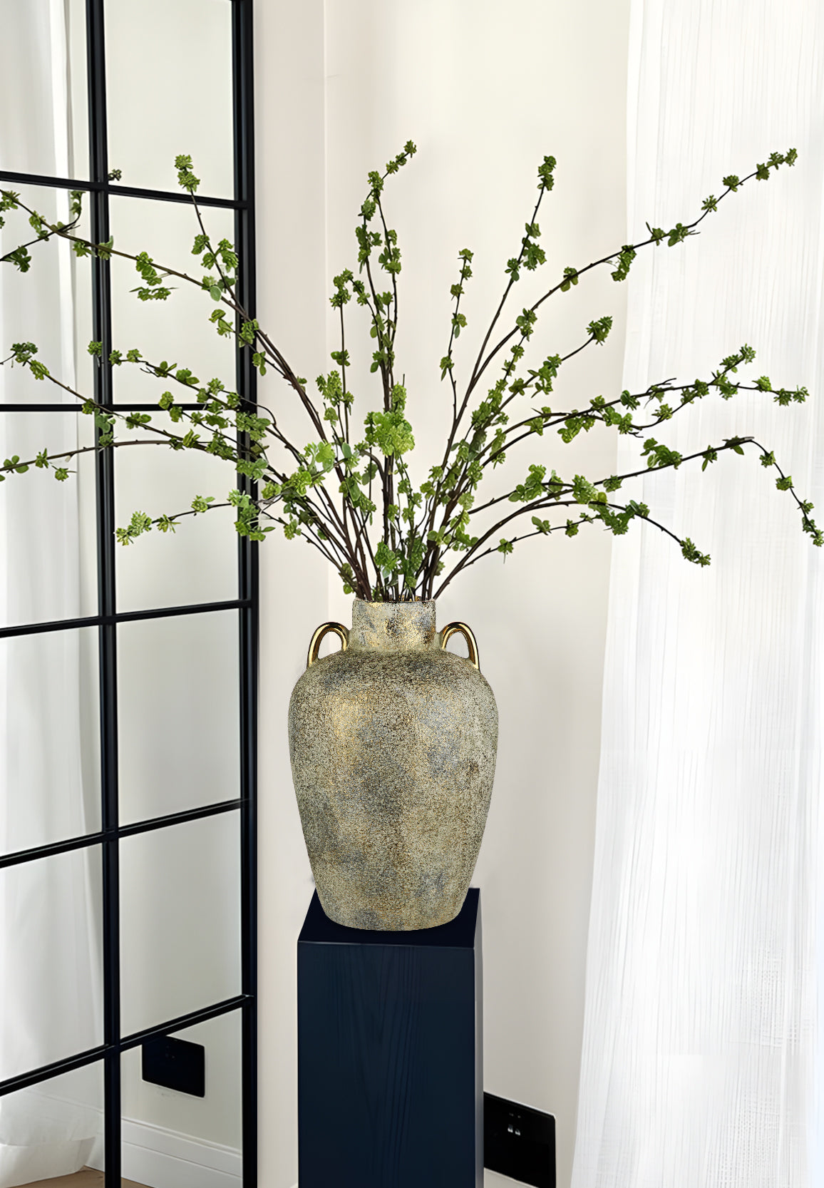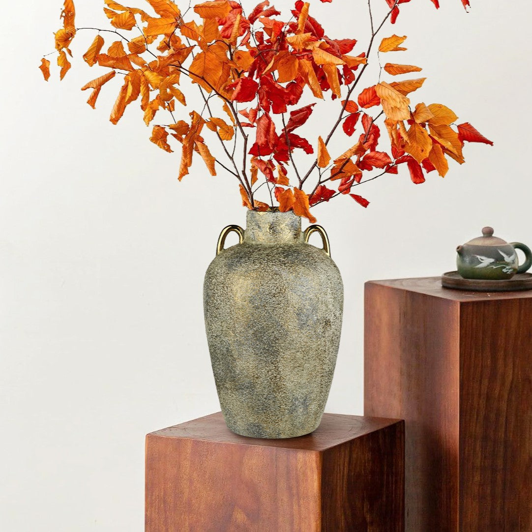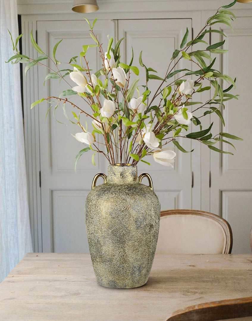 This electroplated ceramic rustic vase, crafted from premium ceramic with a unique gold finish, resists tarnishing while exuding vintage elegance. Its intricate texture and dual-ear design make each piece a one-of-a-kind artisanal treasure, perfect for farmhouse, boho, or mid-century modern interiors.