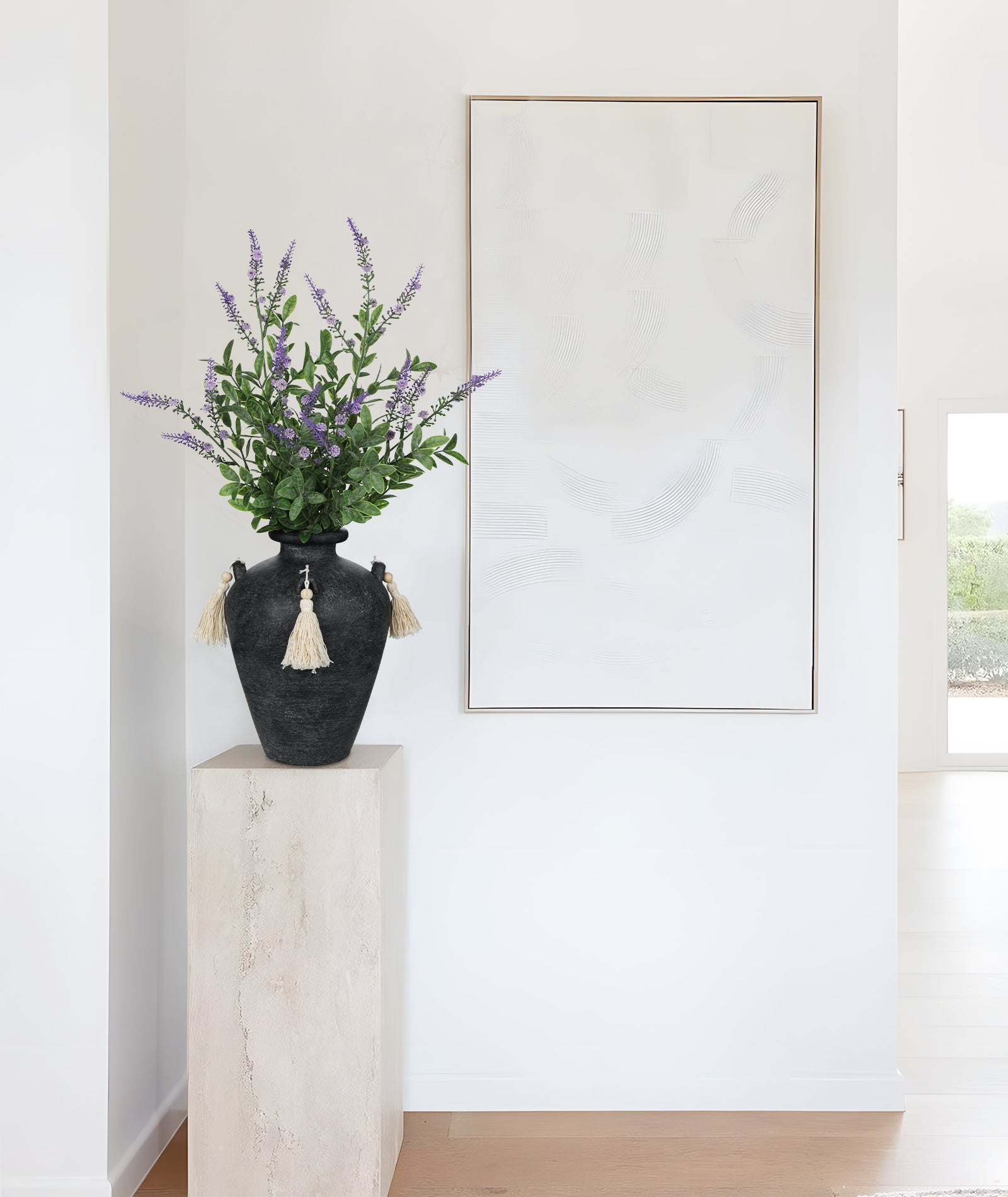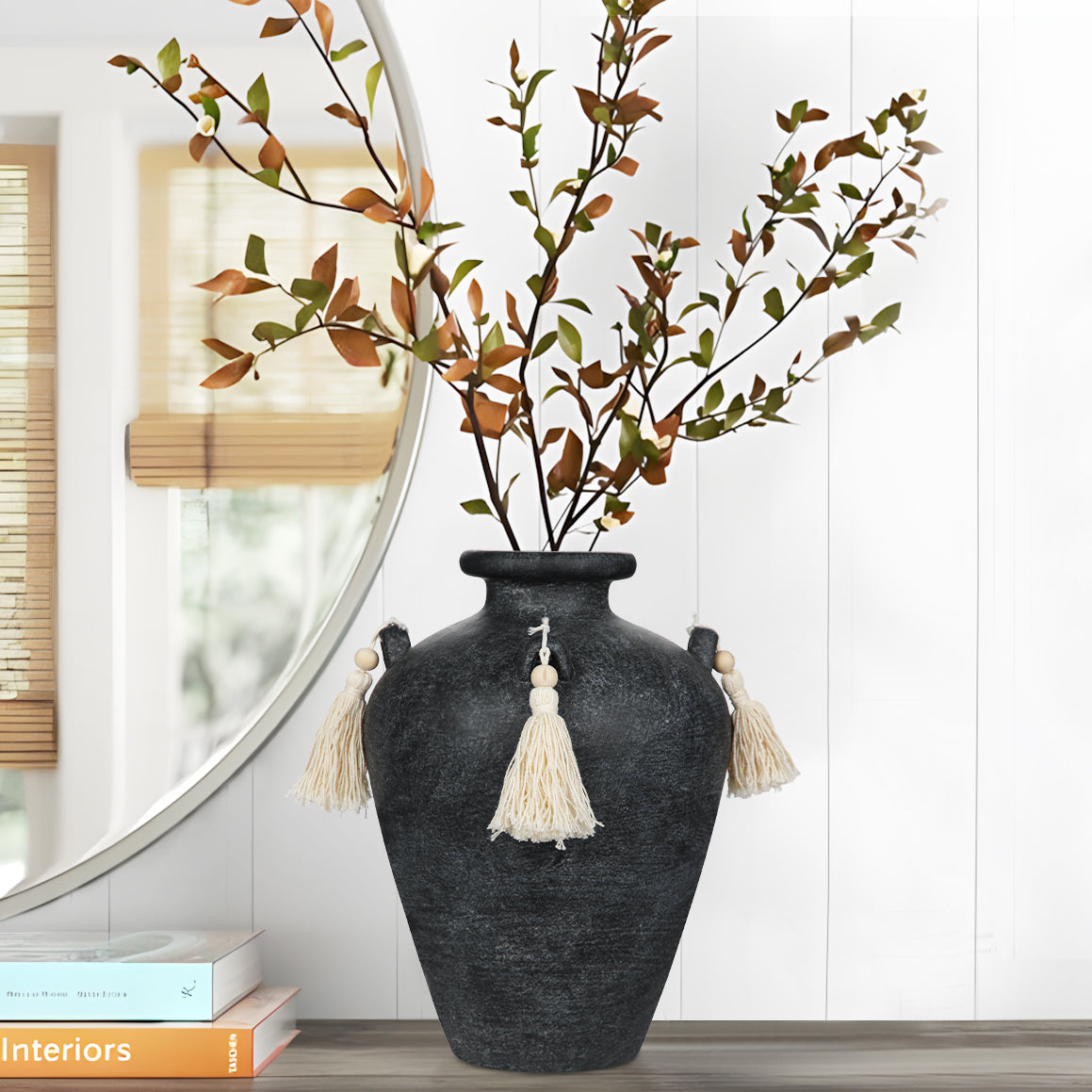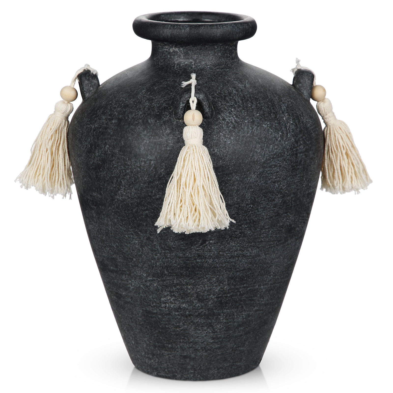 9.4" Black Ceramic Rustic Flower Vase with Tassel for Home Decor