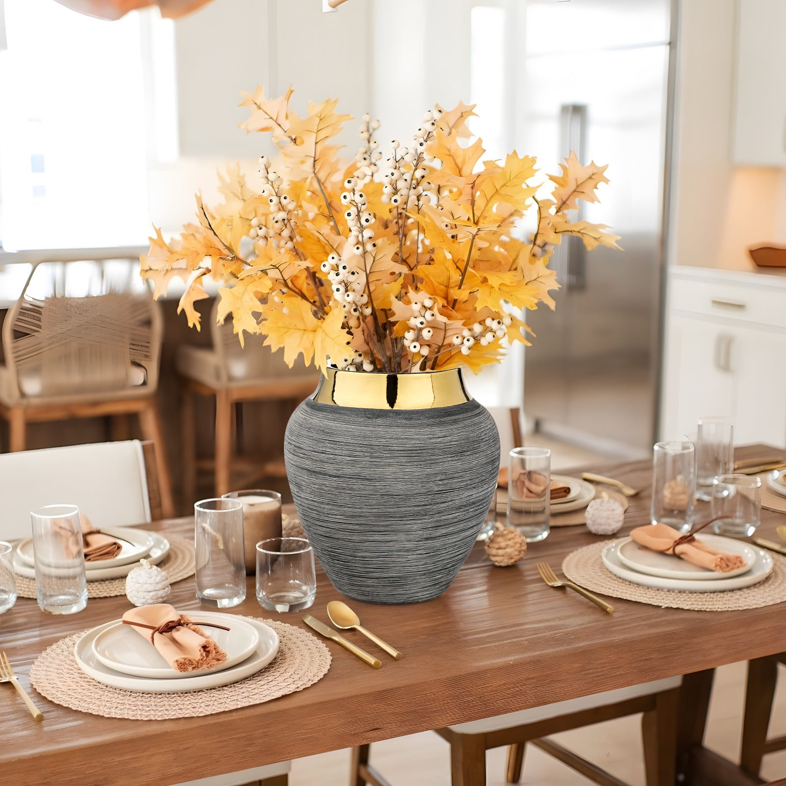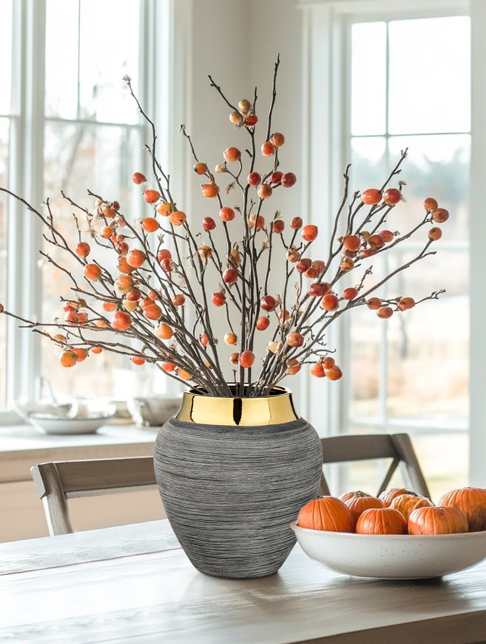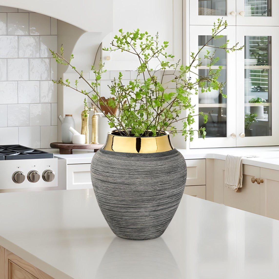 These premium ceramic vases feature a rustic stone-like texture with polished gold rims, blending handcrafted warmth with modern elegance. Made from high-quality ceramic, they balance rustic charm and sophistication seamlessly.