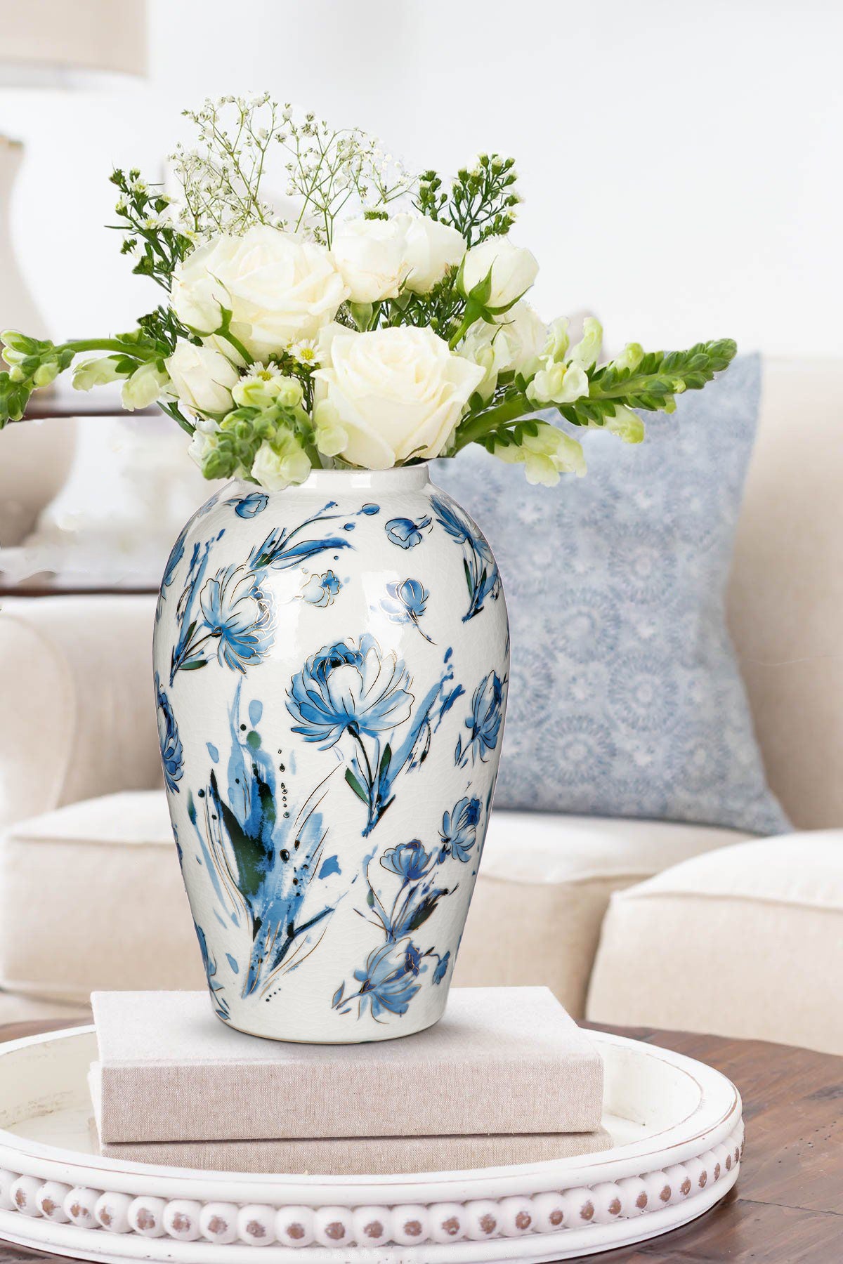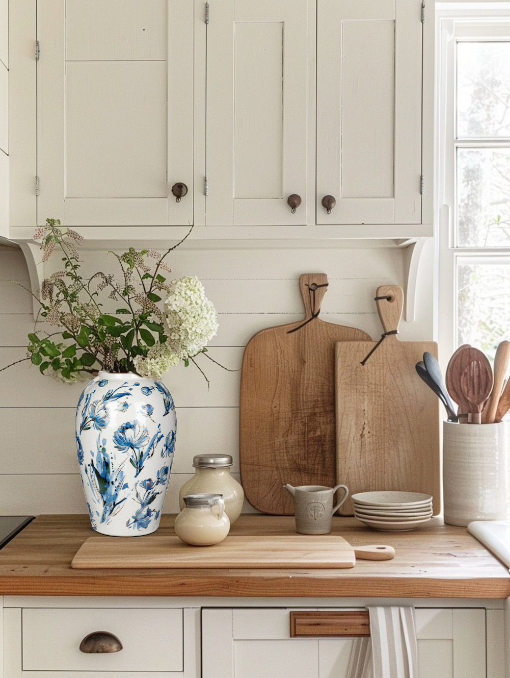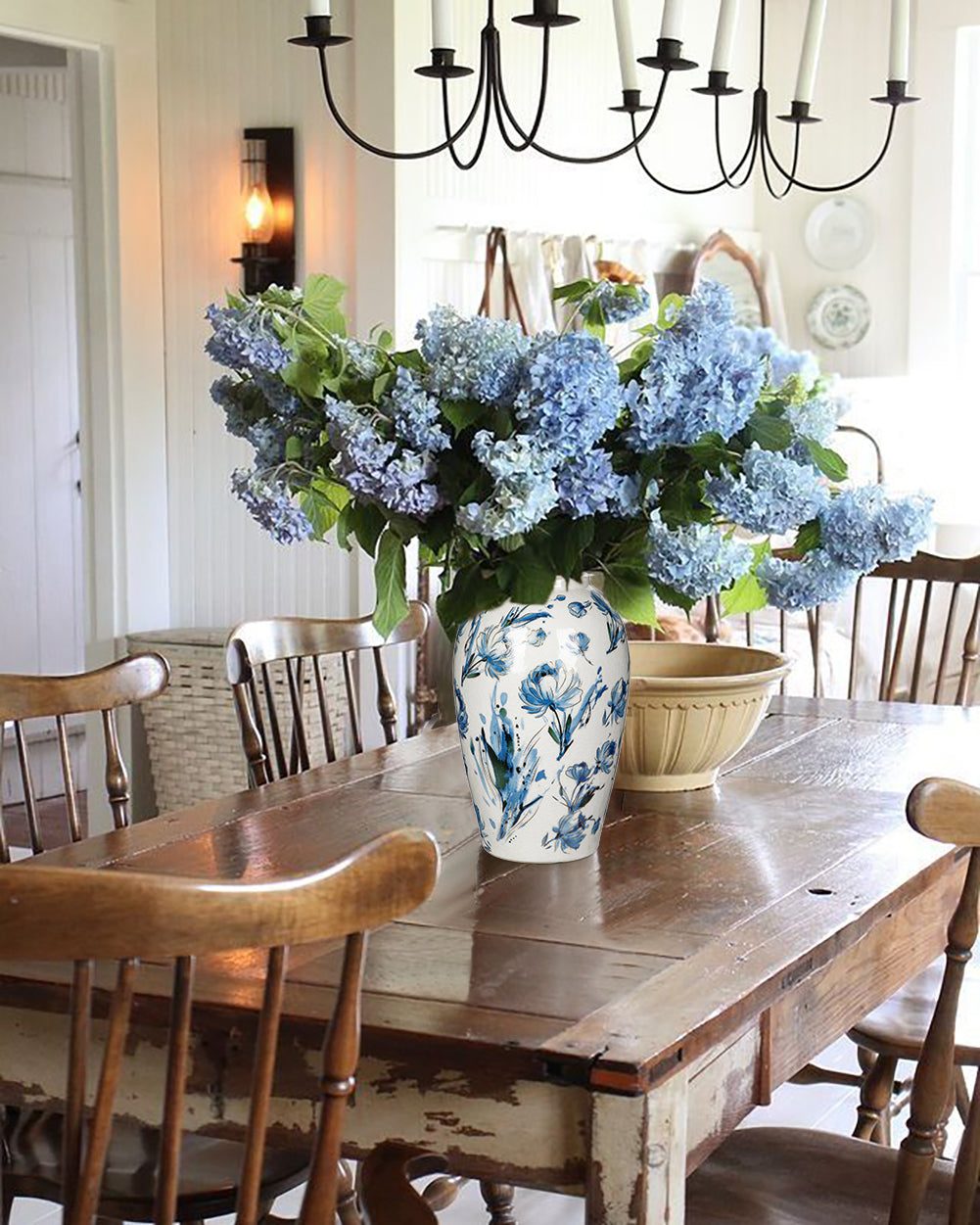 This ceramic vase set features dark blue hand-painted watercolor flowers, bringing European country charm to your decor. The size:9.8" H x 5.5" W, making it perfect for holding flowers, pampas grass, or simply standing alone, perfectly blending into farmhouse, country, or bohemian styles.