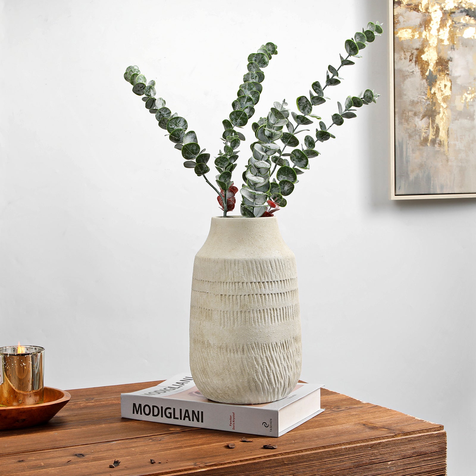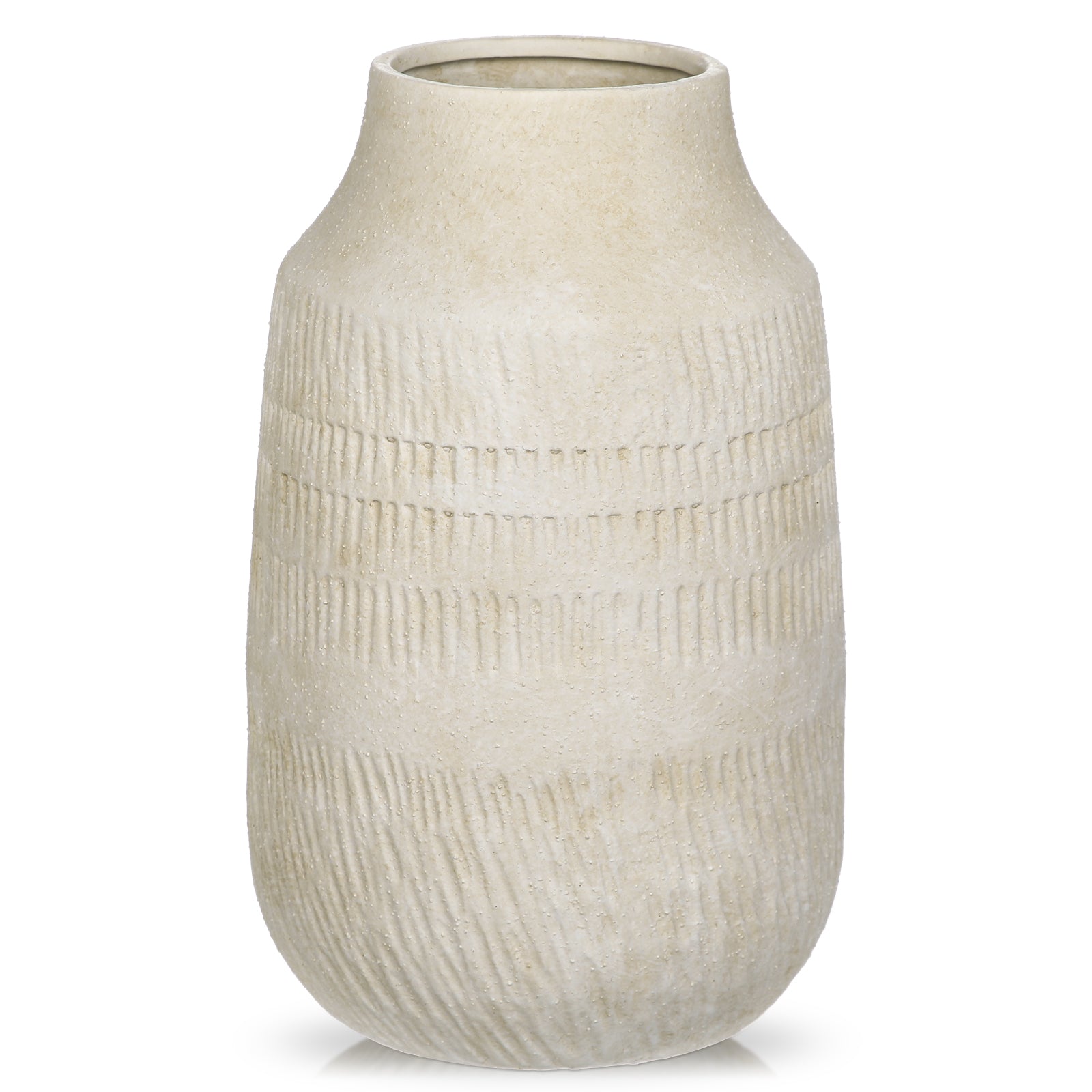 11" Rustic Farmhouse Ceramic Vase with Linear Stripe - White