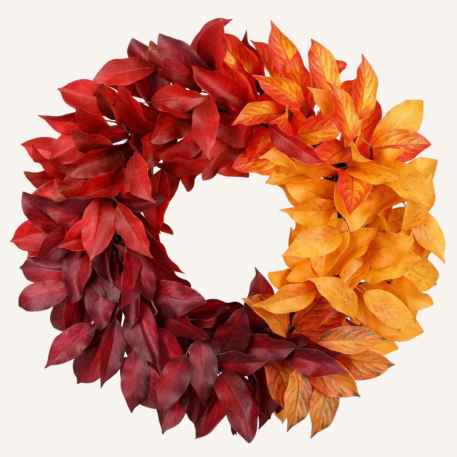 23-Inch Artificial Autumn Wreath: Celebrate fall with lifelike lush bay leaves (cloth material, 3D-printed veins/gradient colors) adorned with natural dark speckles—featuring dark red to earthy brown color transitions, layered textures, and nature-inspired details. No shedding or fading; usable year-round. Packed folded (15” diameter) in a protective paper box—reshape easily to full 22” size. Includes a built-in hook for tool-free hanging; lightweight for hassle-free seasonal rotation. Suitable for indoor/outdoor use: front/back doors, porches, windows, mantels, walls, etc. Perfect for harvest events, Thanksgiving gatherings, parties, or daily fall decor.