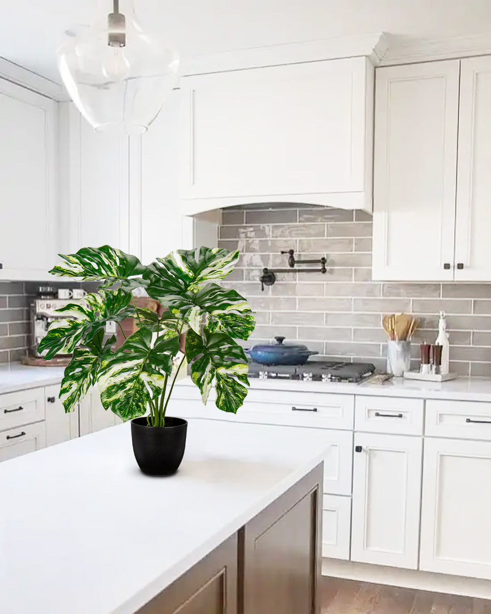 Crafted from high-quality silk and plastic, the plants feature 8 large split leaves total, with a smooth touch, bright white-green tropical hues, and clear textures that make them true replicas of living Swiss cheese plants. Each potted plant stands approximately 17” tall, paired with a 4.7”W x 4.3”H plastic pot for stable display.