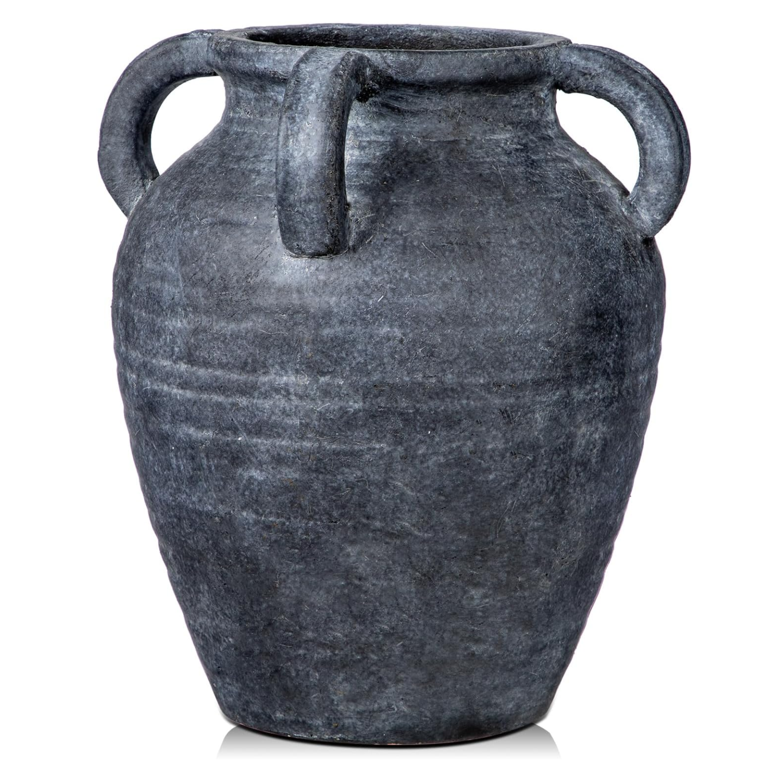 12" Handcrafted Terracotta Vase – Artisan Decor Piece. 3 curved handles, tapered silhouette (10.4" widest, 5.1" opening) for blooms/branches. Matte slate gray with organic glaze, suits farmhouse/boho styles.