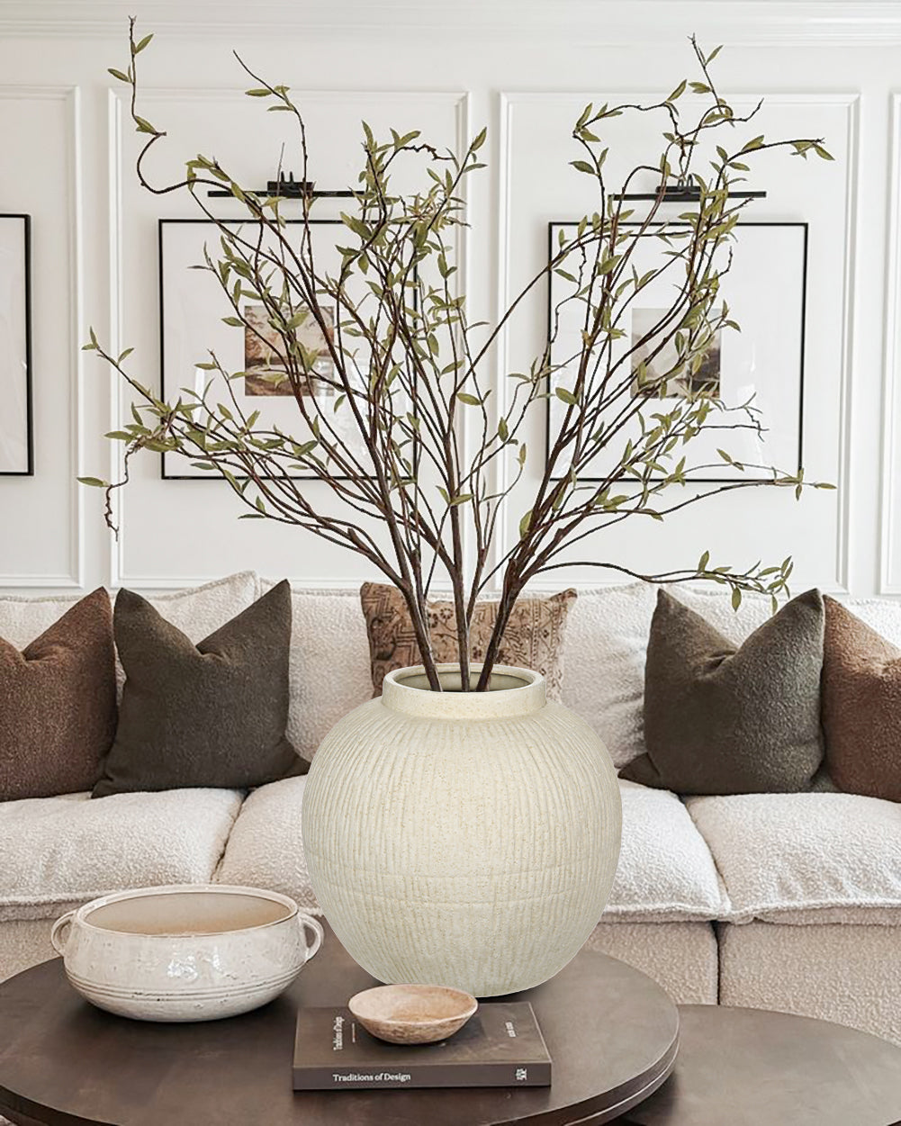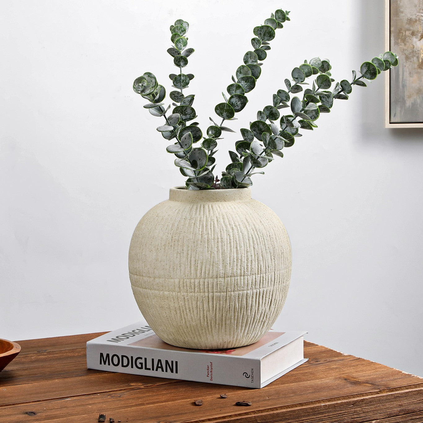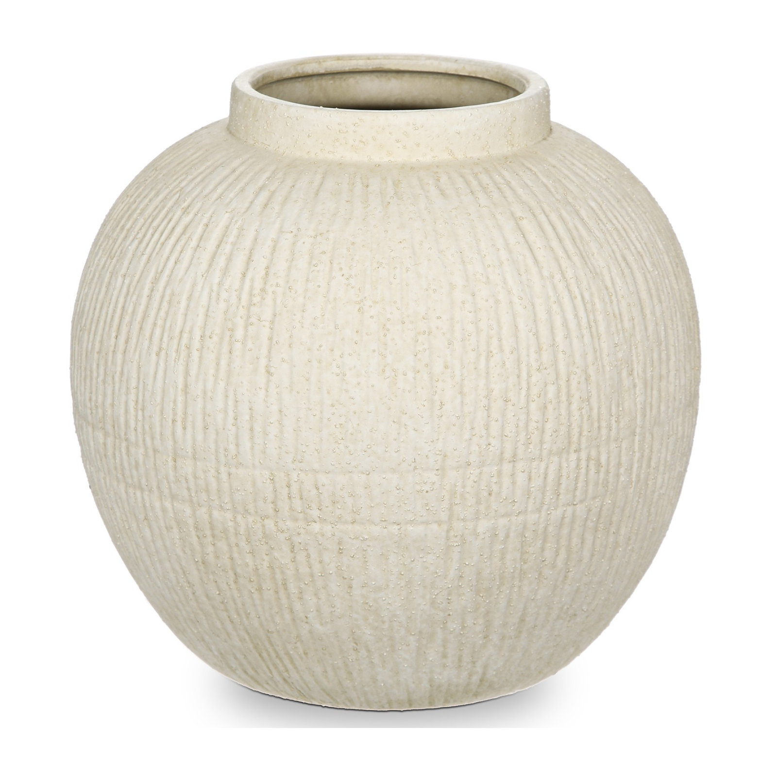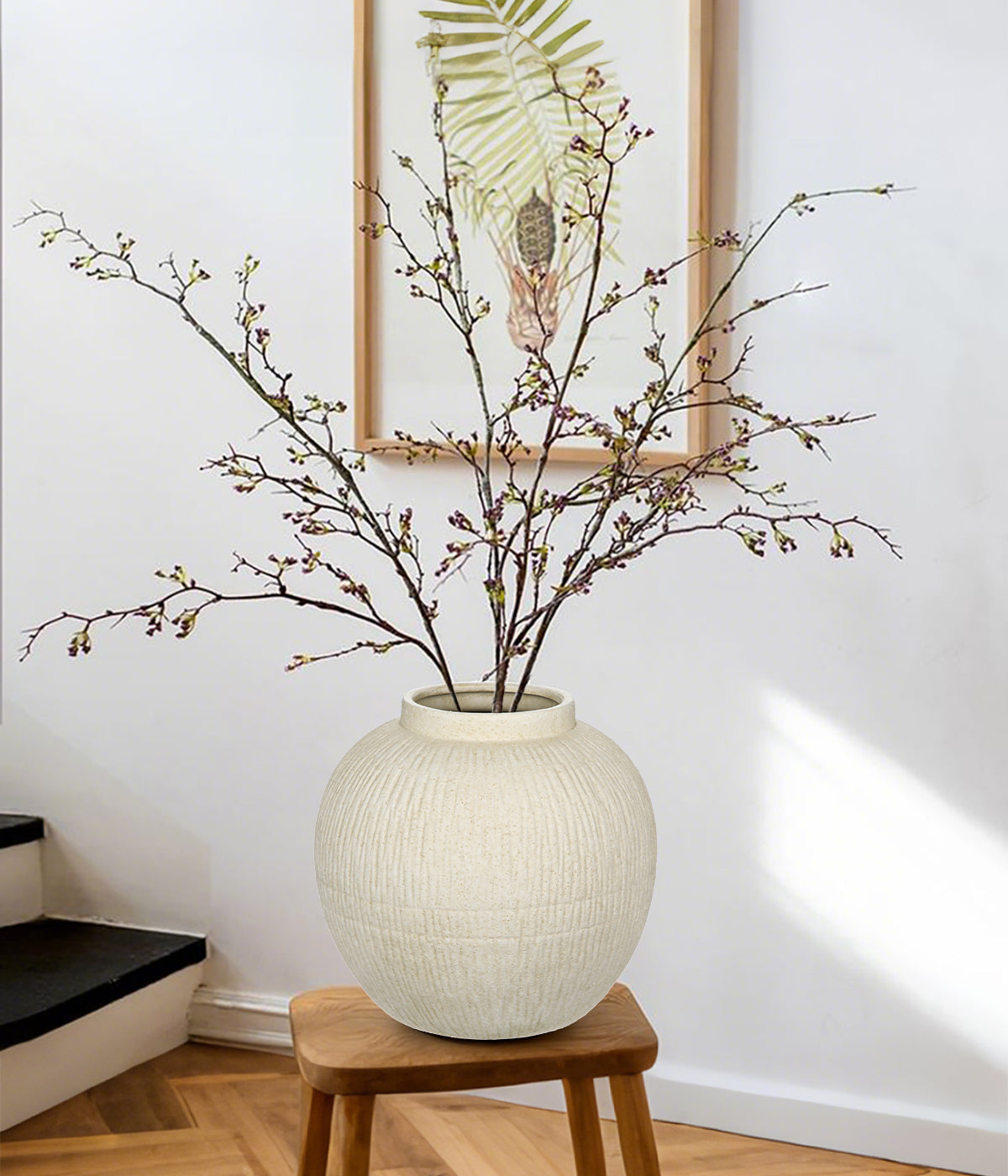 Blending elegant beige-white with linear textures, this opulent ceramic vase, measuring 8.8" tall and 8.6" wide, features a wide belly—perfect for lush floral arrangements with peonies, hydrangeas, oversized roses, or dried wheat. A fusion of ceramics and art, it elevates any display.